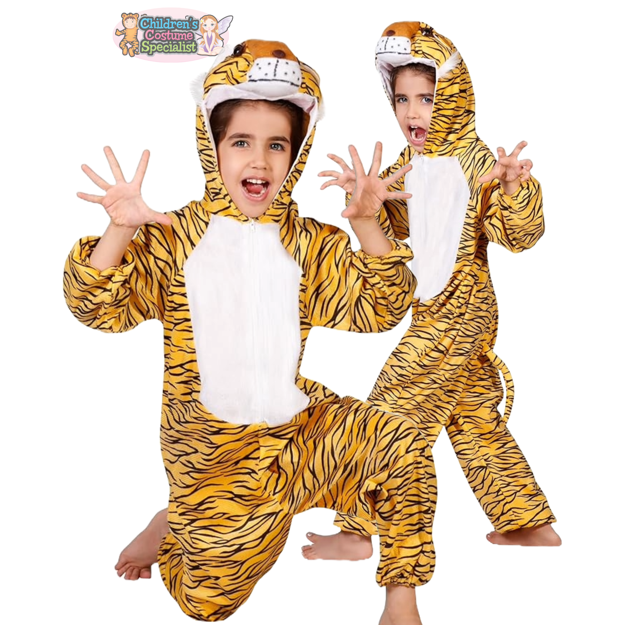 Striking Design: Full-body suit with bold yellow-and-black stripes, a white chest panel, and a hood featuring a friendly tiger face with ears and snout.