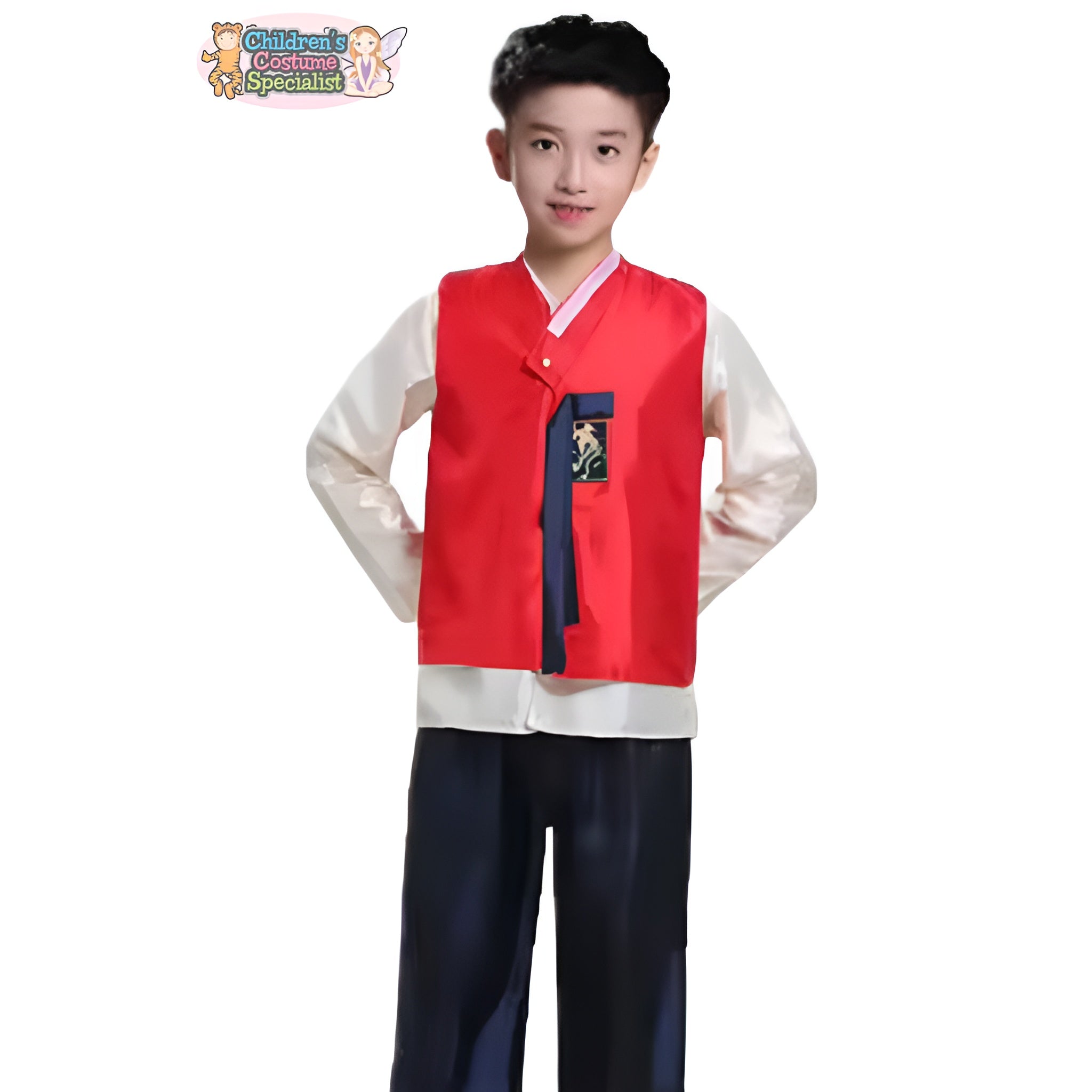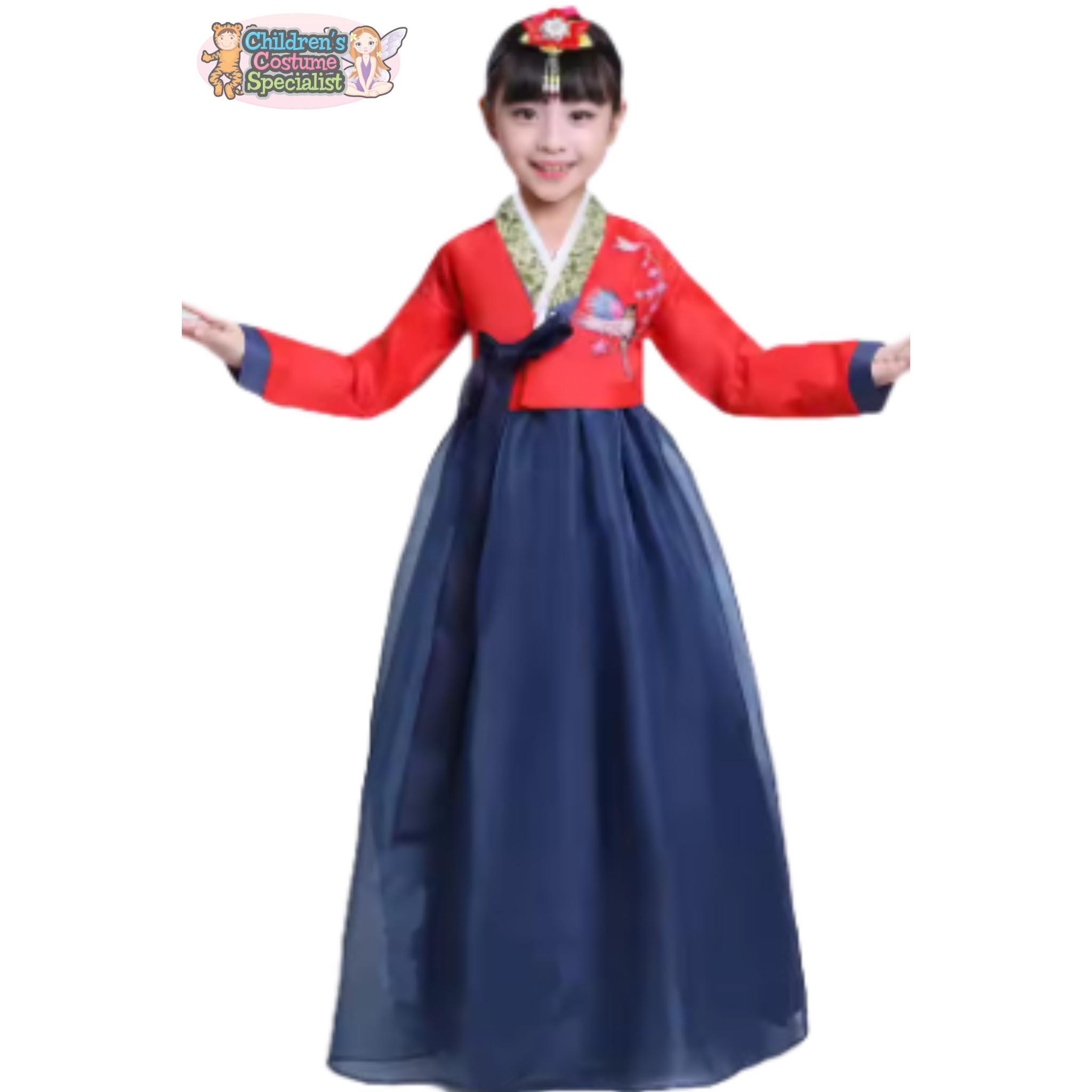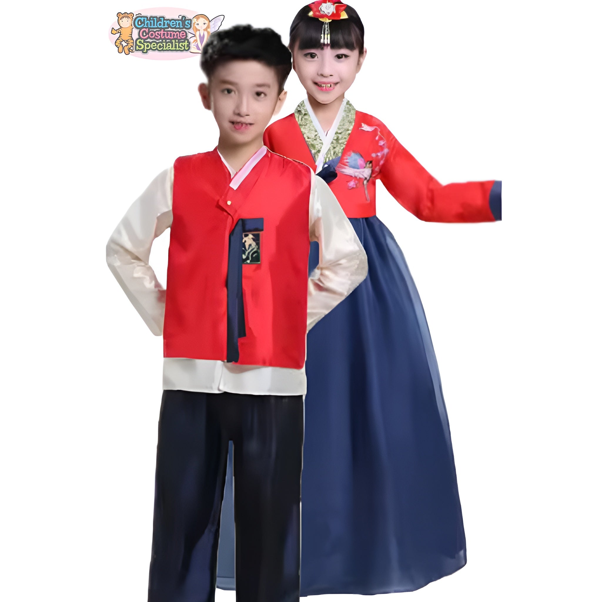 Celebrate Korean heritage with this beautifully coordinated Children’s Hanbok Set, featuring matching designs for boys and girls. The girl's hanbok showcases a vibrant red jeogori with floral embroidery and a flowing navy chima, paired with a graceful hair accessory. The boy's hanbok complements perfectly with a red vest over a cream long-sleeve top and dark blue pants, accented by a traditional patch detail. Ideal for holidays, birthdays, cultural events, and family photos, these outfits blend elegance, comfort, and tradition—making every moment memorable.
